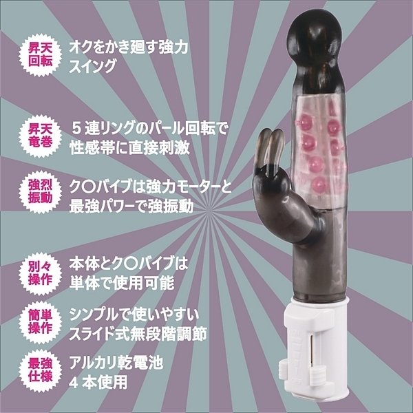 5連パールのトルネード回転と超爆振ク〇バイブで一気に昇天。挿入部はモチモチ素材を採用し、従来のザ・バイブのカタチから少し変えて丸みを帯びた形状へ変更。スムーズな挿入と局部内を優しく圧迫します。丸いのでGス〇ットへのアプローチもスムーズで奥イキ派のニーズにもしっかり答えてくれます。大粒5連パールリングは局部内でトルネードのようにグリグリ回転。ポ〇チオをグリングリン刺激し一気に火照りMAX。ク〇バイブはかなり強力なので要注意。このク〇バイブだけでも十分に愉しめるのに、Gス〇ット・ポ〇チオ、ク〇トリスの3点攻めで大満足。潮ふき昇天すること間違いなし!本体とク〇バイブは別のコントローラーなので使い勝手のきく仕様。自分好みに育てて下さい。●カラー:ピンク