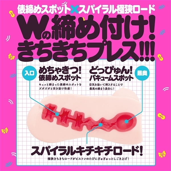 ぎゅぎゅっと締め上げ!生締まり快感!豊満肉厚BODY約480g!俵締めスポット×スパイラル極狭ロードでWの締め付け!奥にはどっぴゅんバキュームスポットを搭載!空気を抜いて挿入することで最高のきちきちプレス!直接肌に触れるものだから安心の国産素材&国内生産。MADE IN JAPAN使うほどにあなたに馴染んで成長するもっちり人肌感覚の革命的新素材「momochi」使用。パッケージイラスト:イチリ