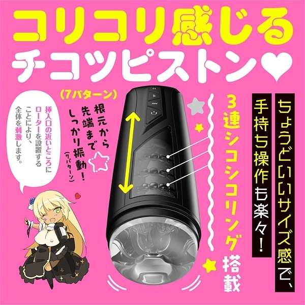 コリコリふるえるチコツピストンの電動オナホ!3連シコシコリング搭載のコリコリピストン7パターン!多彩なパワフル振動7パターン!ホールは直接肌に触れるものだから、安全性と感触にこだわった高品質なエラストマーを使用しています。ぷにっと柔らかい優しい肌触りの超肉厚挿入口!高弾力のもっちり感触で耐久性抜群!極小イボと巨大イボの360°密集地帯は100%刺激系!初心者にも優しく使いやすい電動ホールです。シンプルボタンでラクラク操作!ホールを取って洗うだけ、後処理簡単!ちょうどいいサイズ感で、手持ち操作も可能!ぷにあなちゃんが喘ぐシコシコボイス収録(CV:そよかぜみらい)。パッケージイラスト:maruku