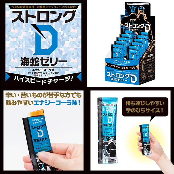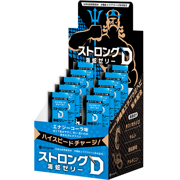 ハイスピードチャージで芯からパワーがみなぎる!琉球地方古来より、伝統的高級食材として珍重されたエラブウミヘビの圧倒的な滋養力を基に開発された、大人気「ストロングD海蛇」シリーズからゼリーverが登場!アミノ酸42種類・ビタミン・ミネラルが豊富なウミヘビ成分&相性の良い厳選成分に「マムシ抽出液、タツノオトシゴ抽出粉末、亜鉛含有酵母エキス、アルギニン」を贅沢に組み合わせて配合。いきり立ちたい夜の即戦力にぜひ!ツルンと口の中を滑っていく飲みやすい食感です。エナジーコーラ味で甘味が強めなので辛い・苦いのが苦手な方にオススメです。10個綴り