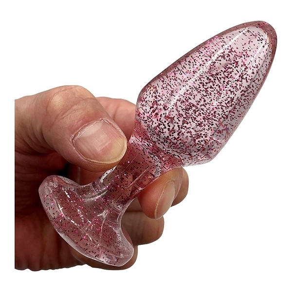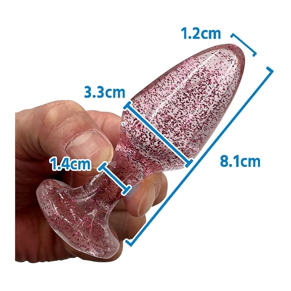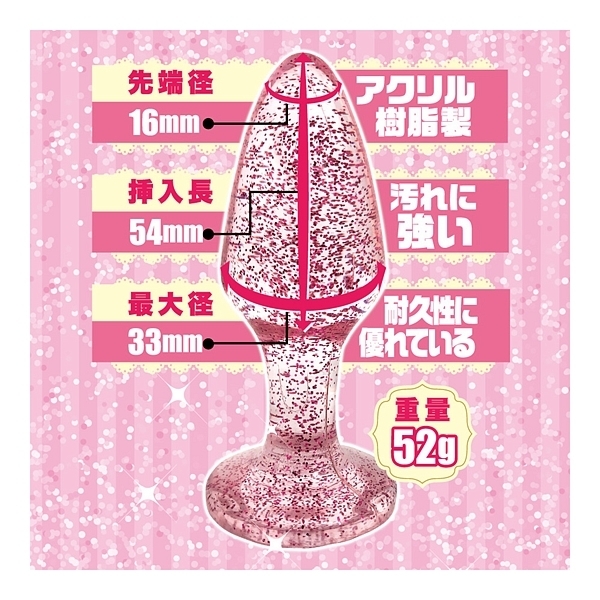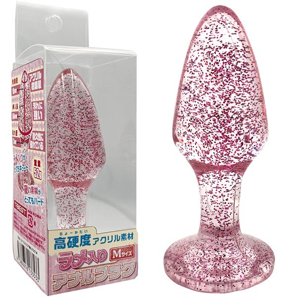 ラメ入りがとってもキュートなキラキラ系アダルトグッズ、「ラメ入りア●ルプラグ」!気分はまるでパーティー♪透明ボディの中には、キラキラのラメがみっちり入りました。眺めているだけで楽しくなる可愛いアイテムです。本体素材には、魅力を高めるアクリル樹脂を使用しました。アクリル樹脂はガラスのような透明さをもちながらも優れた耐衝撃性で割れにくいのが特徴です。耐水性もあるので水や汚れに強くメンテンナスの簡単さもポイント。さらにはカチカチの高硬度タイプ。柔らかいア●ルプラグには無い自己主張の激しい刺激にきっと魅了されるはず。キュートな見た目とは裏腹にハードなア●ルプレイをお楽しみください。「Mサイズ」は、全長94ミリに太さ32ミリのミドルサイズ。ステップアップを目指す方や、拡張に挑戦したい方などにオススメです。