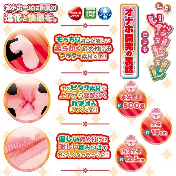 狐仙女による新たな刺客が届いた!!正確にはまだ仙女には至らない未熟な狐三姉妹の末っ子である。今回の刺客は「ガブ噛み妖技!!もちっとカミリー」ガブ噛みというだけあって、噛まれる感覚が斬新な一品!噛まれると言ってもそこは性的な情緒に溢れた仕上がりとなっており、つまりは次のようなコトである。1、もっちりとしたアウターにぬぷぬぷと吸い込まれる。2、もっちりアウターがゆっくりと締め付け絡んでくる。3、インナーの上下にハード素材のジョリ突起がある。この1〜3を組み合わせる事で斬新すぎる「ガブ噛み」体験が出来るのである。いなりんりんが自信満々に言ってくる。「キミのアソコをカミリーしちゃうよっ」