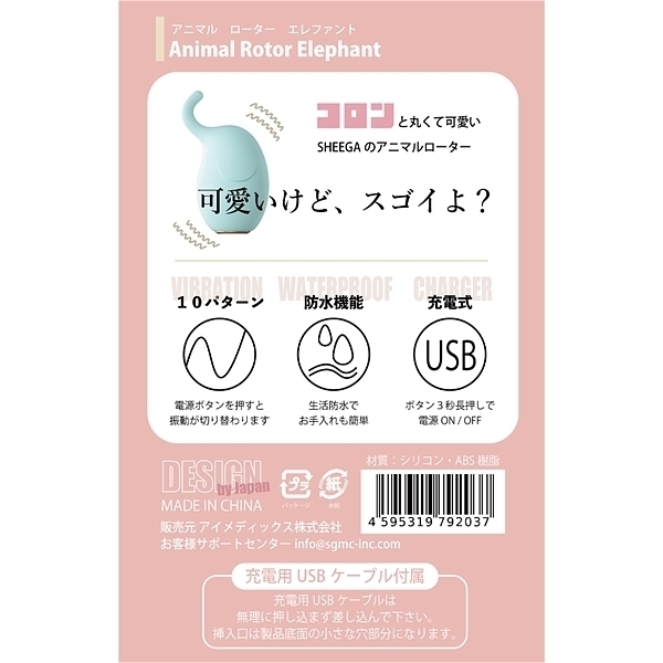 「SHEEGAはこんなに可愛い見た目とは裏腹に実は…」高品質なシリコンを使い肌触り抜群のシリコンローターです。10段階の多彩な振動を搭載。ゾウさんのやわらかい鼻も良いアクセントになり、絶妙な肌触りでいろんなポイントを刺激できます。あなたにあったきもちよさを発見してください。一見ローターには見えない商品に仕上がっており、流行りのくすみカラーで可愛さ抜群です。お部屋のオブジェにもなるおしゃれなローターです。