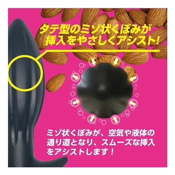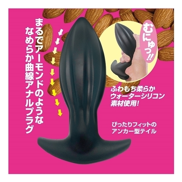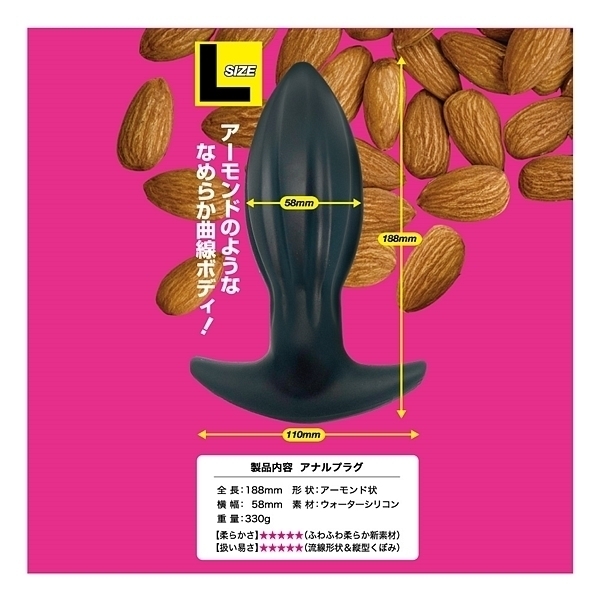 アーモンドフォルム×ウォーターシリコン!形状と素材にこだわった、新感覚ア●ルプラグが新登場!アーモンドナッツのような形状は、先端部に向かってすぼんでいく流線フォルムとなり、スルッとした挿入感を生み出します。さらに、中央部に配置された縦縞状のくぼみが、空気や液体の通り道となり、挿入心地をサポート。最下部は返しの付いた錨モデルで、ヒップラインに沿ったデザインが違和感を低減させます。本体素材には、最先端のウォーターシリコン素材を使用しました。水のように柔らかい、と大評判の人気素材です。すべすべな滑らかさ、もっちりとした肉感弾力、ゴムのように伸びる高伸縮性。あなたにピッタリ寄り添う恍惚素材とスムーズなインサートとなる快感型状で、新しいア●ルプラグです。「L」は太さ58ミリのエキスパートモデル。