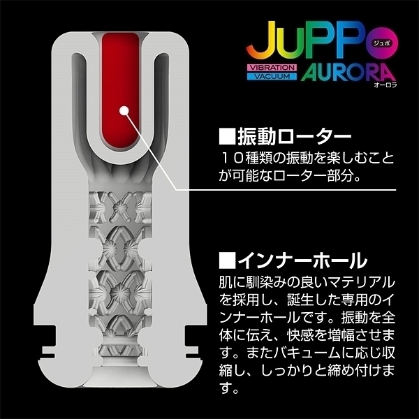 強力な吸引と振動で大人気のJuPPoが送り出す新たな官能のカタチ。今回のJuPPo AURORAはターボ機能が加わり、より一層の密着感と振動感をお楽しみいただけます。簡単な操作でリアルを超えたプレイをお楽しみください。本体は簡単に分離が可能なので、使用後は速やかにインナーホールを外し洗浄が可能です。充電は本体背面にある充電ポートに付属のUSBケーブルを挿してください。振動と吸引で導く新たな官能体験。ぜひ、ご堪能ください。