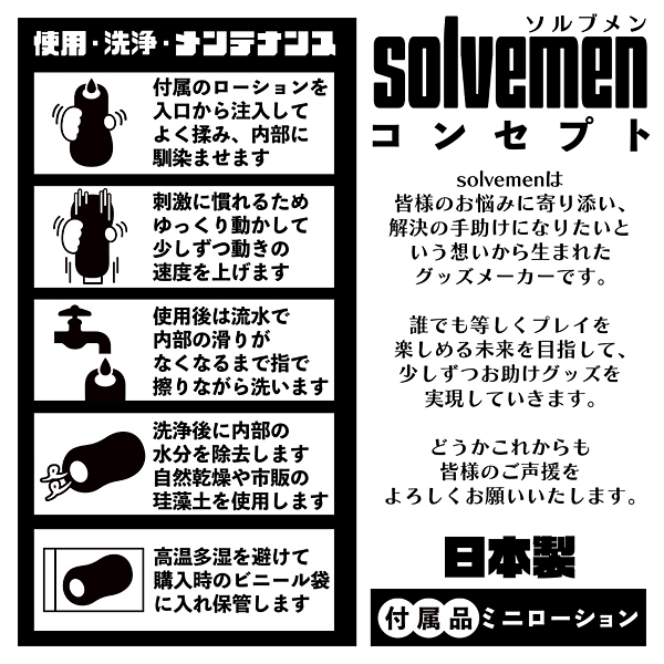 ソルブメンはあなたのお悩みを解決する存在です。皆様はこのような話をご存知でしょうか?「オナホは同じ構造でも素材が変わると使用感が違う」はい大正解です。それは真理です。でも世の中は同じ構造かつ別素材のオナホを必ずしも発売してくれません。それでは素材の違いによる使用感の変化を楽しむ事ができません。そんな時こそsolvemenにお任せください!全く同じ構造ながら二層構造の内部素材を変えたものがコチラ。「高刺激こすられ二層」と「低刺激ねっとり二層」になります。見た目は同じなのにアラ不思議。高刺激と低刺激を楽しめます。まるで魔法のようにあなたの快感を惑わせる事でしょう。素材だけではございません。「絶頂刺激連続ヒダ突起構造」と名付けた特殊な内部構造をご覧ください。どの素材でも一定の感度を担保する安定感の高い内部構造となっております。あなたはオナホ選びに悩む必要はなくなります。あなたのためにソルブメンがいるのです。安心安全の日本製で繰り返し何度でも利用が可能です。●高刺激