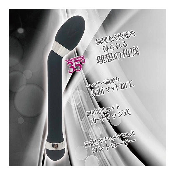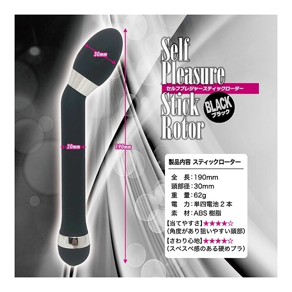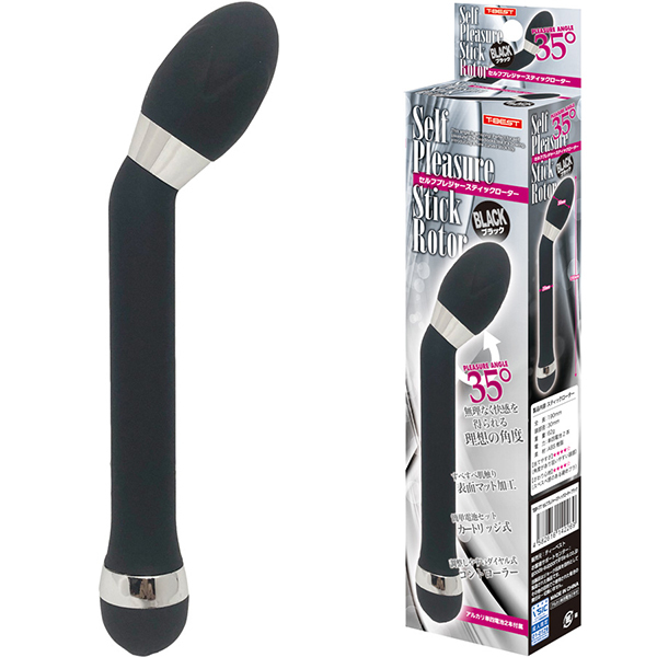 この角度が凄い!セルフプレジャーにピッタリ!おじぎをするように頭部が曲がったタイプのスティックトイが新登場!全長19センチのセルフプレジャー向けのスティックローター。傾斜度35度、狙った箇所に当てやすいように頭部の角度を曲げました。この傾斜度が、無理な体勢を強いらずに、自然に楽で気持ち良い姿勢へ促すことでしょう!さらに、振動を強弱調整しやすいダイヤル式コントローラー。電池をセットしやすい、カートリッジ式。使いやすいサイズとなる、全長19センチに、頭部直径3cm。握りやすい、スティック部直径2センチ。軽くて持ちやすい、重さ62グラム。すべすべと肌ざわり良い、マット表面加工。貴方自身をもっと輝かせる、セルフなプレジャーを応援するスティックローター!●カラー:ブラック