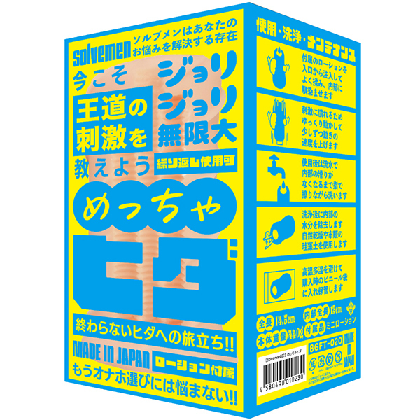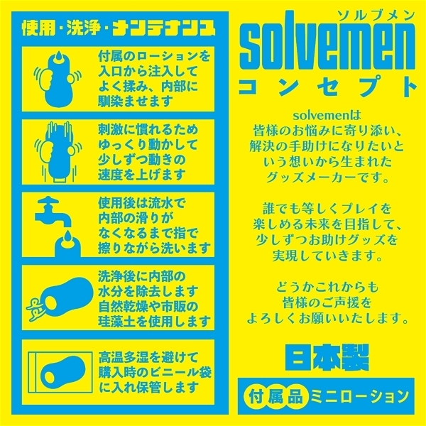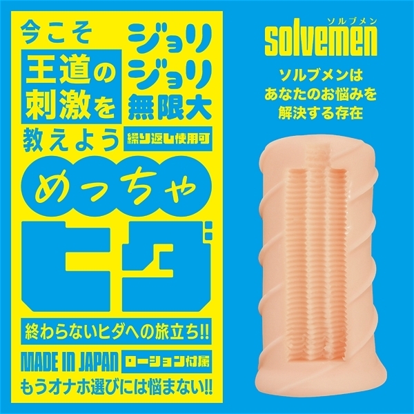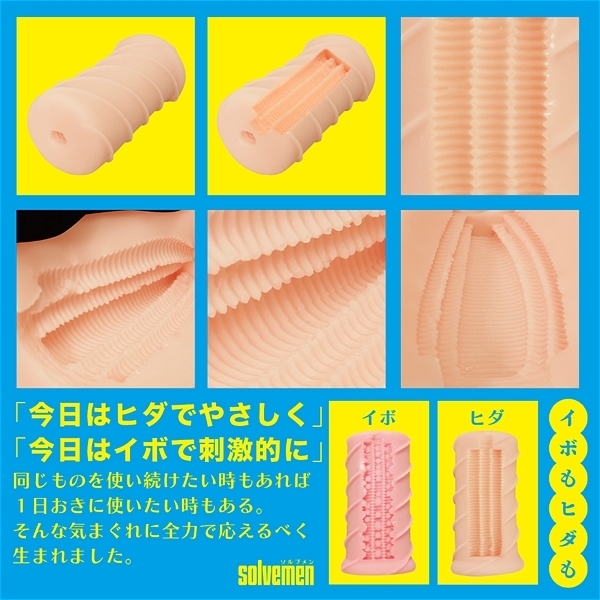 ソルブメンはあなたのお悩みを解決する存在です。「今日はイボで刺激的に」「今日はヒダでやさしく」同じものを使い続けたいときもあれば、1日おきに違うものを使いたいときもある。そんな気まぐれに全力で応えたいです。それがソルブメンの生まれた意味だと思いませんか?今回のテーマは「めっちゃヒダ」となります。今こそ王道のヒダで勝負する意図とは?ヒダは常に王道かつ安牌。それは間違いないのです。しかしヒダも千差万別。配置や素材一つで快感は簡単に変わります。ヒダの絶妙な掘り込み具合で生まれる極上の擦られ感覚をお楽しみください。あなたはオナホ選びに悩む必要はなくなります。あなたのためにソルブメンがいるのです。安心安全の日本製で繰り返し何度でも利用が可能です。