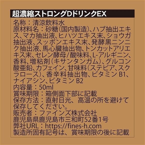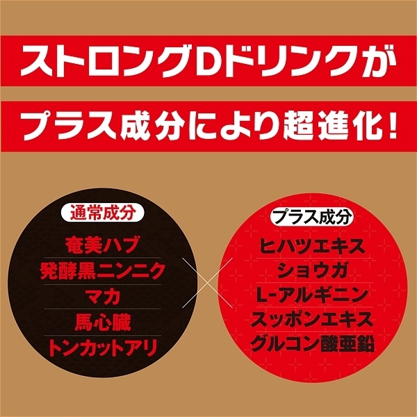 <原材料>砂糖(国内製造)、ハブ抽出エキス、マカ抽出液、ヒハツエキス末、ショウガ抽出液、スッポンエキス末、発酵黒ニンニク抽出液、馬心臓抽出物、トンカットアリエキス末、セレン酵母/酸味料、L-アルギニン、香料、増粘剤(キサンタンガム)、グルコン酸亜鉛、カフェイン、甘味料(ステビア、スクラロース)、香辛料抽出物、ビタミンB1、ナイアシン、ビタミンB2