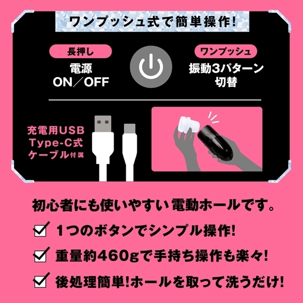 電マオナニーを電動ホールで超再現!『男性が電マを体験したら、まさにこんな感じなんだろうな。』という超パワフルヘビー級振動の電動オナホの登場です!振動機能に振り切った完全振動特化型!強弱3段階で最大毎分 約9000回のパワフル振動でメス堕ち確定!初心者にも使いやすい電動ホールです。1つのボタンでシンプル操作!後処理簡単!ホールを取って洗うだけ!重量約460gで手持ち操作も楽々!インナーホールは直接肌に触れるものだから、安全性と感触にこだわり高品質なエラストマーを使用しています。さらっとなめらか人肌感触です。弾力性抜群で激しくしても壊れない耐久力があります。内部構造は360°無限イボがびっしり!はっきりとわかりやすいダイレクトな刺激をお楽しみください。稼働音を気にせずプレイに集中できる静音設計≦65dB。防水機能IPX6。※IPX6:放水ノズルを使って噴流水を最低3分間あてる試験(浸水は不可)充電用USB Type-C式ケーブル付属。