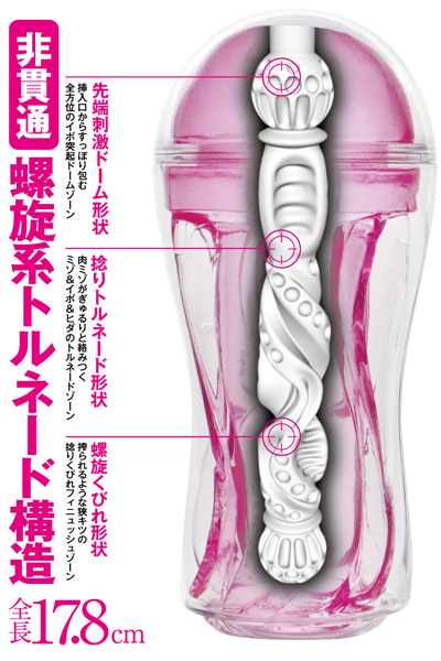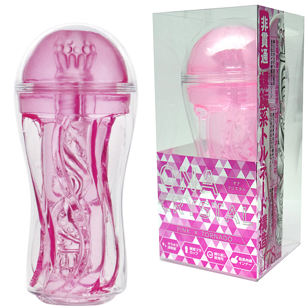透き通るその姿は、まるでクリスタルのよう。見た目がとっても美しいオナカップ「オナクリスタル」!キラキラと光るような透明感をもつ繰り返し使えるカップ入りオナホールです。取り扱いやすいプラカップケースにぷりぷり弾力の肉感インナーホール、バキューム感も楽しめる非貫通式で快感ギミックが詰まった内部造形、目で見て刺激が分かる透明カラーと見た目以上に使い心地もマーベラス。カップからのホールは着脱可能なのでお掃除もバッチリです。カップに着けたままでムギュッと肉感に包まれるハードなプレイを。カップから取り外ししてトロンと開放感たっぷりなゆるゆるプレイを。カップ着脱で異なるプレイスタイルをお楽しみいただけます。「ピンクカラー」は、ぎゅるぎゅると絡みつく螺旋形トルネード構造。ドーム状にすっぽり包む挿入ゾーンから、肉ミゾがぎゅるりと絡むトルネードゾーンに、搾って捻れるキツフィニッシュゾーン、とトルネードのようなワンダフルな快感をご体験ください!