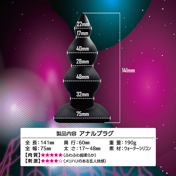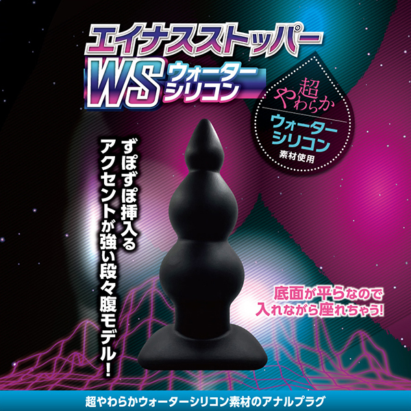 ビギナーからマニアまで楽しめるアナルストッパーが最新素材になって新登場!こちらの「エイナスストッパー WSウォーターシリコン (06)」は3段階を経て徐々に太くなるアナルボールが、挿入すると穴中を押し拡げながら快感を味わわせてくれます。アナルビーズっぽい感覚で引き抜くときにも気持ちいい♪新素材のウォーターシリコンだから負担も少なくアナルの魅力を最大限まで満足させてくれます。シリコンを超える進化素材は超しっとりで凄なめらか!しっとりきめ細やかな質感に、生々しい生体的な肉感弾力、人体や環境にも優しい安心材料が否が応でも気分を高めてくれます。挿入感を高める流線的なフォルムに極上の肉々しさをプラスしたプレミアムなアナルプラグ!こちらは太さ1.7〜4.8センチのストッパーとなっておりますので、挿れるときの感覚や引き抜く時の存在感、程よい異型感が強めなのでノーマルなプラグ形状に飽きた方にもおすすめです。アクセントの強い段々腹モデルですので、メリハリのある玄人快感をお求めの方はどうぞ!
