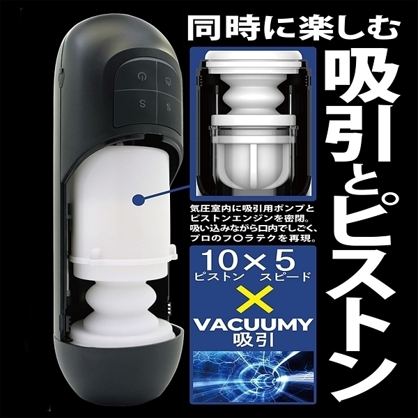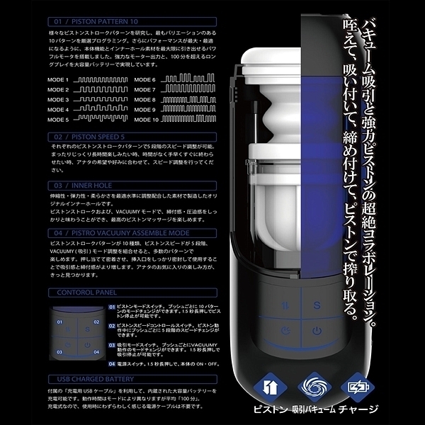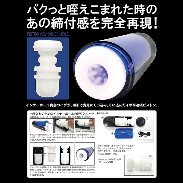 バキューム(吸引)しながらピストンでシゴく電動オナホール。フェラの達人の超絶技巧を完全シミュレート。優しく吸引されながら、ピストンでシゴかれてください。10種類のピストンパターンと5段階のスピード操作、7種類のバキュームパターンで自分に合った変化を楽しめます。標準インナーホール「PISTRO VCM INNERHOLE」搭載。挿入物に向けて伸びる大きく長いイボを多数配置し、四方八方から絡みつきます。約120分の充電で約100分の動作が可能。※使用方法・メンテナンス方法は必ず同梱の説明書をお読みください。