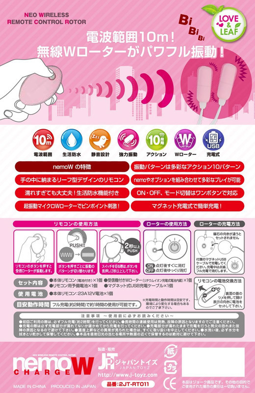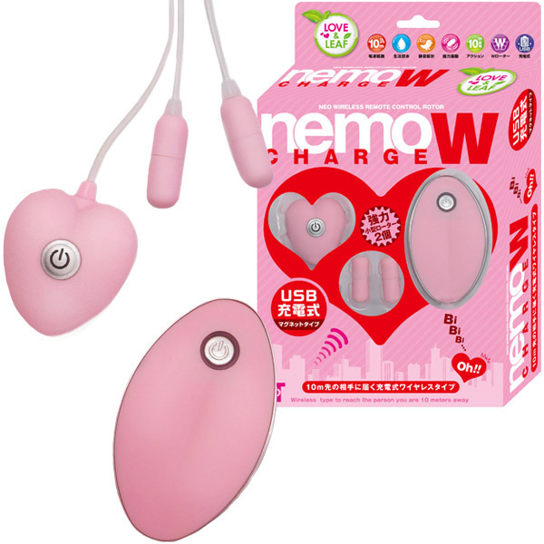 遠隔操作で楽しむキュートなリモコンローター「nemo」シリーズの小型ダブルローター。●肌触りの良いピンクマット加工●手に馴染むリーフ型リモコン●ハート型の受信機付きツインローター●受信の最大距離は約10m●小型でも強力な10パターンの振動搭載●ワンボタンでON・OFF・振動切替可●便利なマグネット式USB充電ケーブル付属●約2時間のフル充電で約1時間稼動(受信機)●ローター部分のみ水洗い可。強力ワイヤレスの遠隔ローターシリーズ「nemo」に、ピンポイントで当てやすい小型のツインロータータイプが登場!両乳首やクリ&膣の同時責めなど、幅広いプレイスタイルに対応可能です。受信機は振動時以外も電波受信の為に電池を消費しますので、使用後は必ず電源をOFFにしてください。※付属電池は動作確認用です。