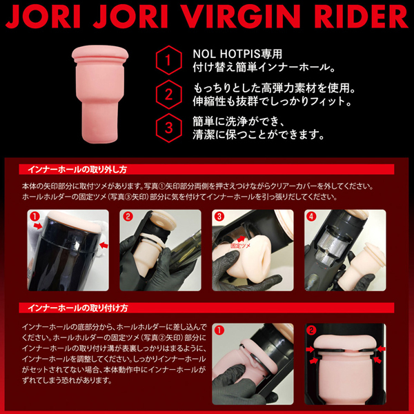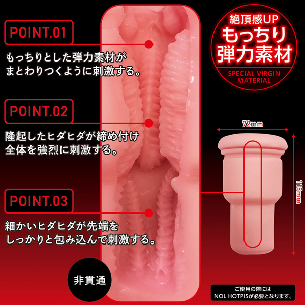 絡みつくジョリジョリはバージン娘の必死の抵抗。もっちり肉厚の幼い秘肉を無情のマシーンが突き動かす。ピストンを極めた電動オナホールNOL HOTPIS交換用ホール第一弾は抵抗するように締め付ける乙女の深部を再現!もっちりとした弾力素材が、まとわりつくように刺激する挿入部。隆起したヒダヒダが締め付け全体を強烈に刺激する中央部。細かいヒダヒダが先端をしっかり包み込んで刺激する最奥部。電動マシン用交換ホールでは再現が難しかった「複雑な内部構造」を日本の職人技術で完成させました。このホールをご使用になるには「NOL HOTPIS(z00736)」が必要です。